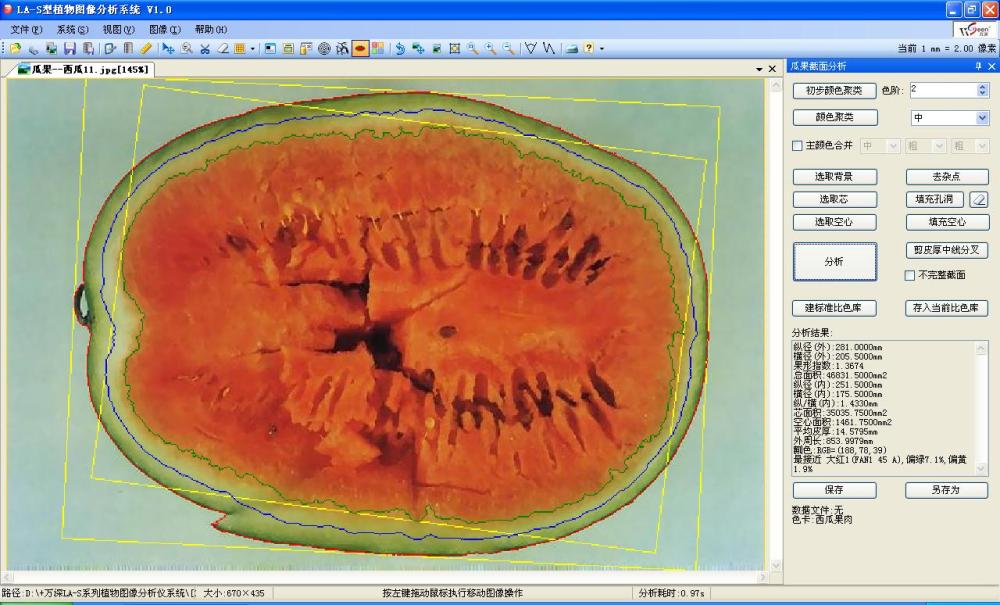 可测西瓜的:纵径、横径、果形指数、总面积、皮厚、空心面积、瓤色分档分析、外周长。